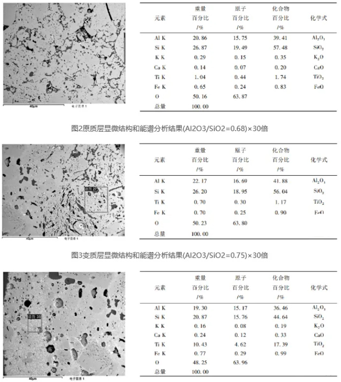 從熱力學上看,Al₂O₃-SiO₂系材料[4]各物相在氯化反應中:莫來石相(A₃S₂)非常不穩定,其成份見表2,石英相(SiO₂)非常穩定,剛玉相(Al₂O₃)居中;在碳熱還原中:石英相非常不穩定,剛玉相非常穩定,莫來石相居中。在實際中,爐襯材料是如何損壞的,其過程是怎樣發生的,這要從殘磚顯微結構分析入手。