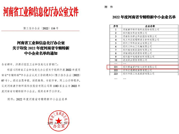 近日,河南省工業(yè)和信息化廳公布了《河南省工業(yè)和信息化廳辦公室關(guān)于印發(fā)2022年度河南省“專精特新”中小企業(yè)名單的通知》。經(jīng)省工業(yè)和信息化廳組織專家評(píng)審,鄭州榮盛窯爐耐火材料有限公司被認(rèn)定為2022年度河南省“專精特新”企業(yè)。這是繼榮獲“國(guó)家高新技術(shù)企業(yè)”、“河南省科技型中小企業(yè)”后,榮盛耐材在科技創(chuàng)新領(lǐng)域獲得的又一殊榮。