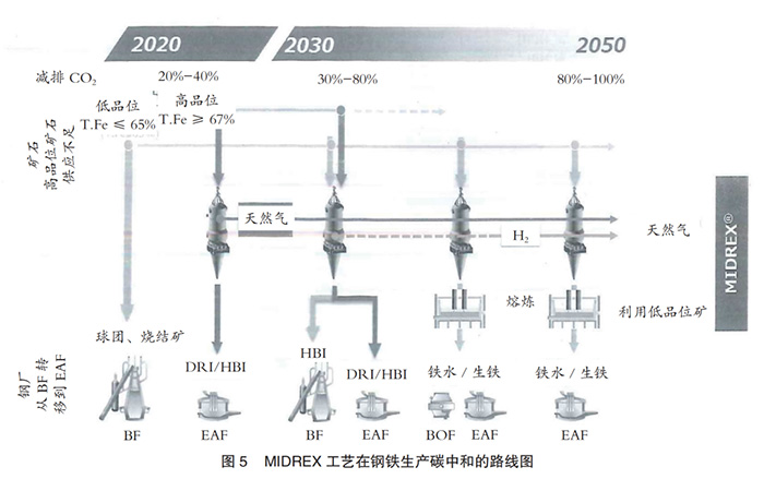 下面的總結說明了通過MIDREX技術實現碳中和的路線。圖5的橫軸表示2050年碳中和的時間已經過去,縱軸表示從礦山到鋼廠的活動和CO2的減排。