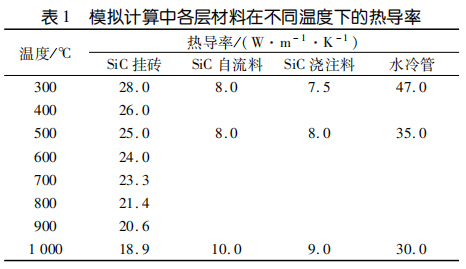 水冷壁內襯的熱傳導性能需要與爐況相匹配,既要盡可能多地將熱量傳導出去發電,又要保證一通道出口溫度不低于 850℃。模擬計算設定耐火材料熱導率恒定,暫不考慮使用過程中耐火材料組成變化對熱導率的影響和爐襯表面積灰對爐襯熱傳導的影響也不考慮掛釘和錨固釘對熱傳導的影響。進行模擬計算時,水冷壁內襯各工作層選取的熱導率見表1。